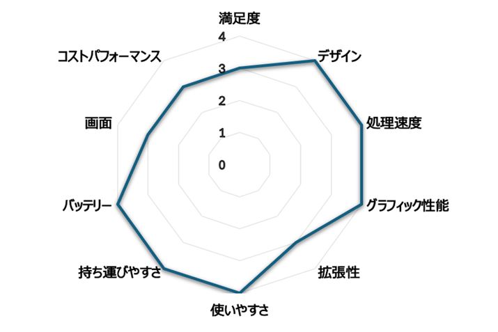 評価項目:満足度、デザイン、処理速度、グラフィック性能、拡張性、使いやすさ、持ち運びやすさ、バッテリー、画面、コストパフォーマンス