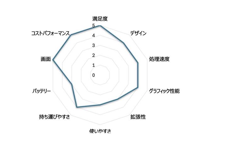 評価項目:満足度、デザイン、処理速度、グラフィック性能、拡張性、使いやすさ、持ち運びやすさ、バッテリー、画面、コストパフォーマンス