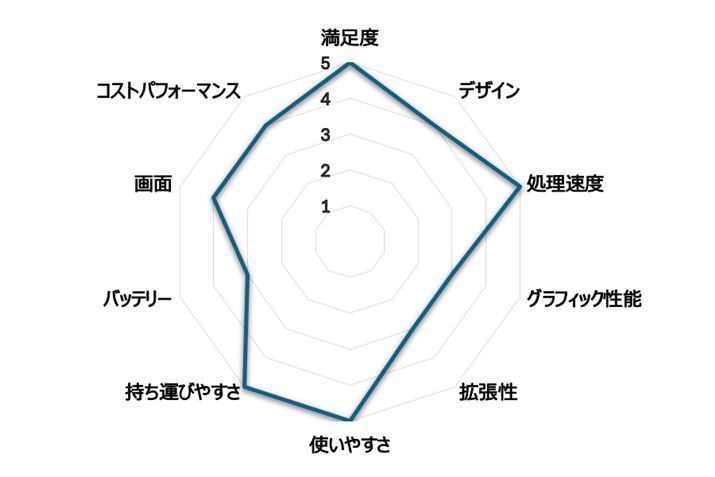 評価項目:満足度、デザイン、処理速度、グラフィック性能、拡張性、使いやすさ、持ち運びやすさ、バッテリー、画面、コストパフォーマンス