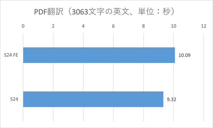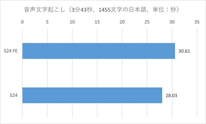 結果は下記のとおり。「S24 FE」は「S24」に対して、PDF翻訳(3063文字の英文)で1.08倍、音声文字起こし(3分43秒/1455文字の日本語ナレーション)で1.09倍の所要時間となりました。