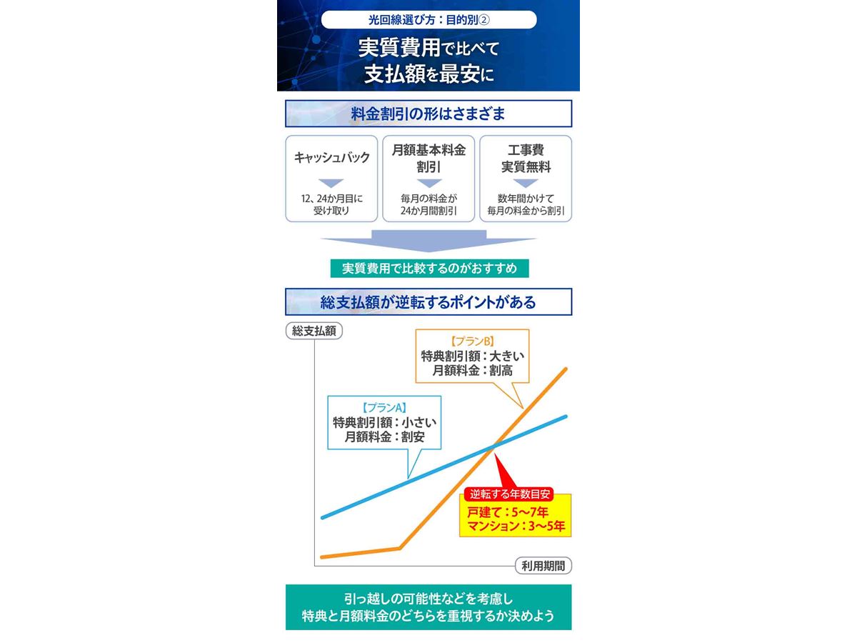 それに加えて、利用期間を考慮するのも大切です。 短期の利用なら、特典の割引額が大きい回線を選ぶとお得になります。しかし、長期で使う場合は、特典より毎月の月額料金が安い回線のほうが総支払額が安くなります。