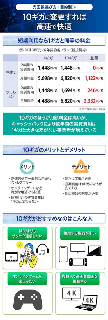 ただし、注意点が2つあります。1つは、10ギガにするには工事が必要になること。もう1つは、Wi-Fiルーターや接続するスマホ、パソコンなども10ギガ対応のものが必要になることです。