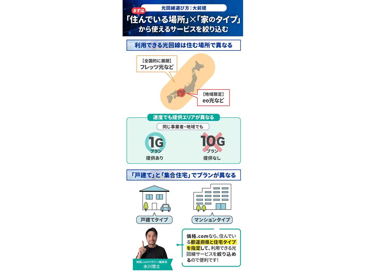 そのため、「自分の住んでいる地域と住宅タイプで利用できるサービスの中から選ぶこと」が大前提となります。価格.comなら都道府県と住宅タイプを指定して、提供されているプランを一覧できるため、候補を絞り込むのに便利です。ただし、同じ都道府県内でも対応エリア/非対応エリアが分かれているケースもあるので、最終的な利用可否は公式サイトで住所を入力して判定してもらう必要があります。