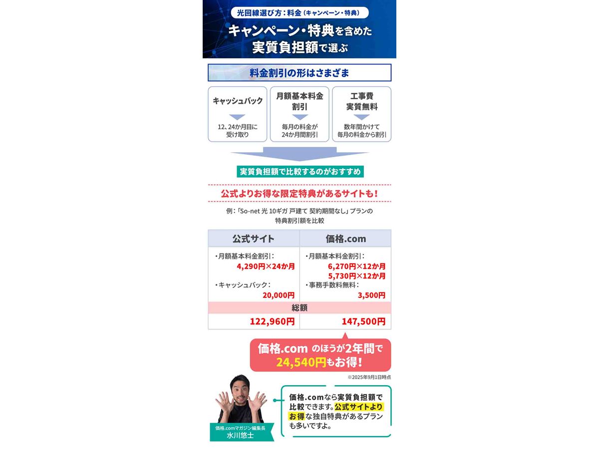 特典によるキャッシュバック額などが不定期で変更になるため、その時々で異なります。価格.comなら「実質費用の安い順」や「月額料金の安い順」などで光回線をチェックできます。また、利用期間・特典の割引総額・月額料金のバランスやスマホセット割が使えるかによっても、いちばんお得なサービスは異なるため、自身の条件に合わせて総合的に判断しましょう。
