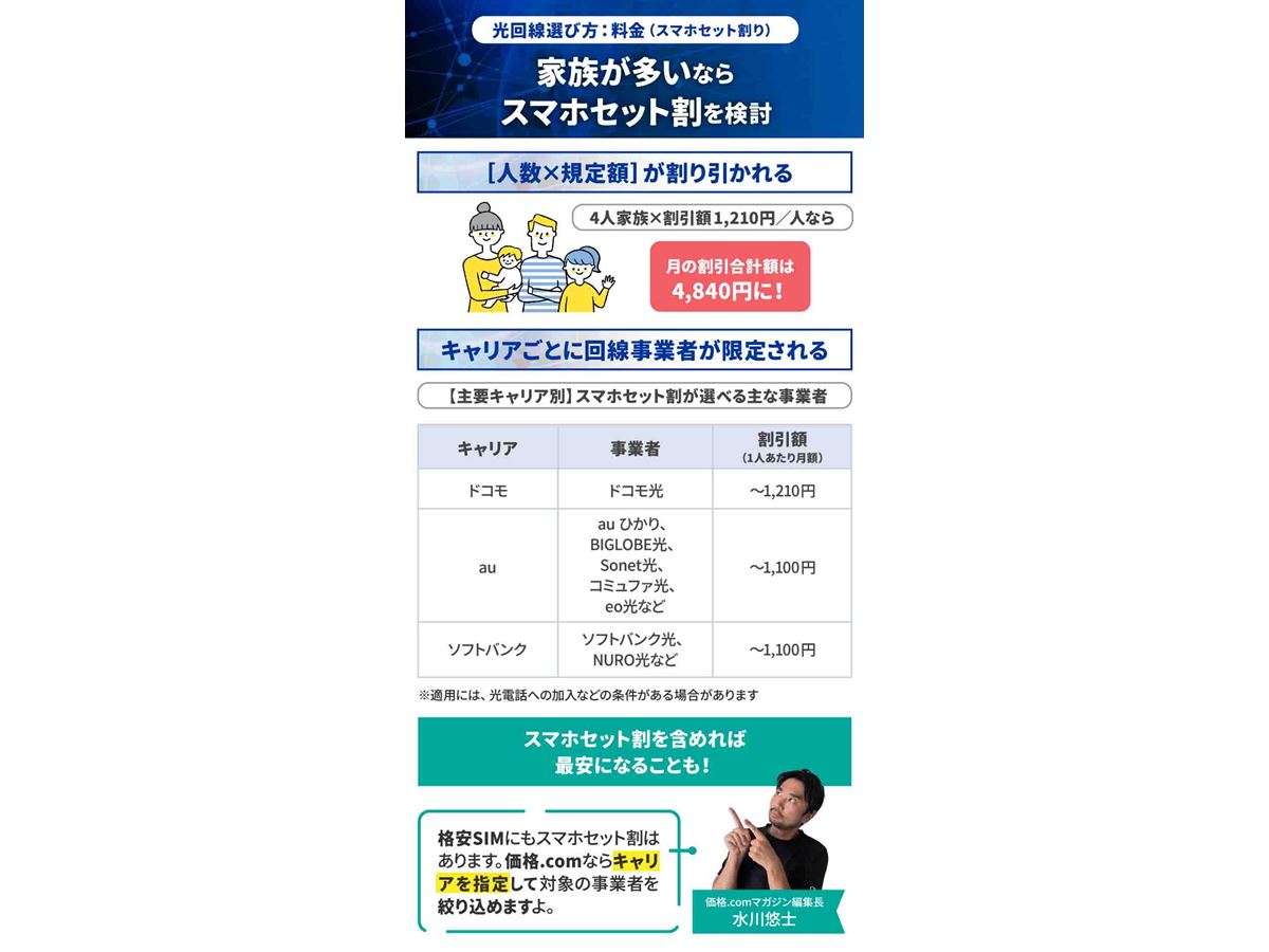 ただし、ひかり電話の契約や特定プラン加入などの条件が設けられていることも多いため、適用要件を確認し、本当にお得になるか慎重に判断する必要があります。なお価格.comでは、利用中のスマホキャリアを指定してセット割を設けている光回線事業者を絞り込めるので便利です。