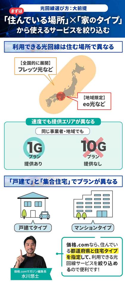 そのため、「自分の住んでいる地域と住宅タイプで利用できるサービスの中から選ぶこと」が大前提となります。価格.comなら都道府県と住宅タイプを指定して、提供されているプランを一覧できるため、候補を絞り込むのに便利です。ただし、同じ都道府県内でも対応エリア/非対応エリアが分かれているケースもあるので、最終的な利用可否は公式サイトで住所を入力して判定してもらう必要があります。