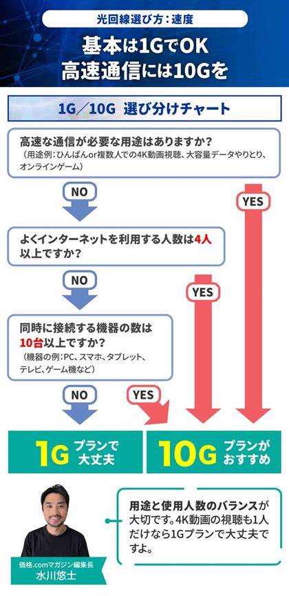 いっぽう、4K動画を複数人で同時に視聴したり、オンラインゲームを快適に楽しみたかったりする場合などでは、10ギガを選ぶとよいでしょう。