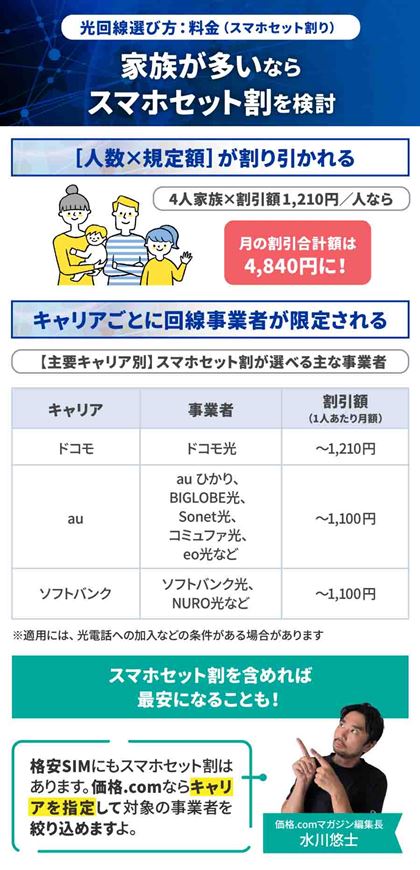 光回線選びで料金のお得さを重視するなら、トータルの支出額を抑えられる「スマホセット割」を活用しましょう。これは、光回線とスマホを同じ事業者、または提携する事業者でまとめることで、条件を満たせばスマホの月額料金が割引きされる仕組みです。