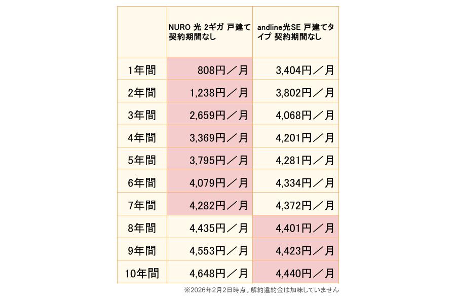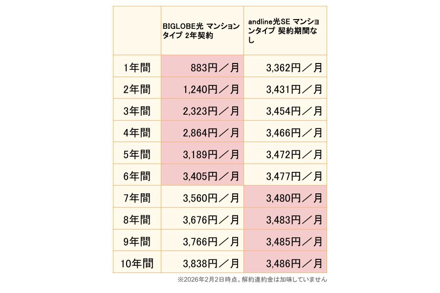 利用開始からの年数別に実質費用を比べると、7年目から安さが逆転しています。想定される利用期間が6年以内なら「BIGLOBE光 マンションタイプ 2年契約」を、7年以上なら「andline光SE マンションタイプ 契約期間なし」を選びましょう。