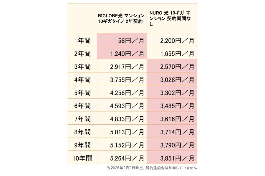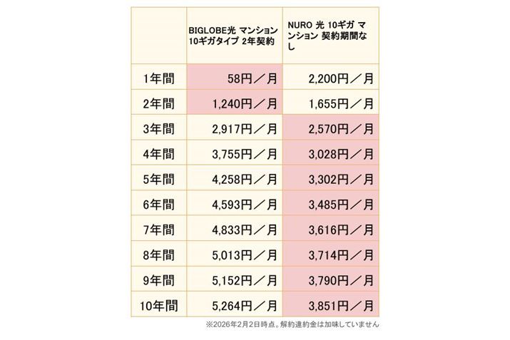 利用開始からの年数別に実質費用を比べると、3年目で安さが逆転します。2年までなら「BIGLOBE光 マンション 10ギガタイプ 2年契約」が安くておすすめです。いっぽう、利用期間が3年以上になりそうなら「NURO 光 10ギガ マンション 契約期間なし」を選ぶとよいでしょう。