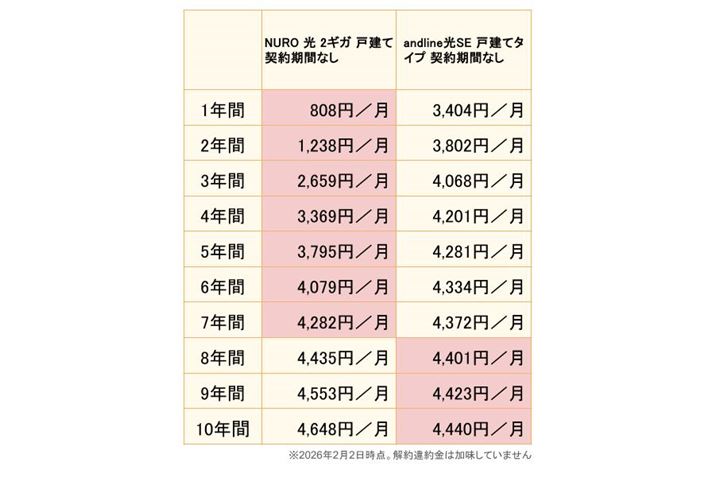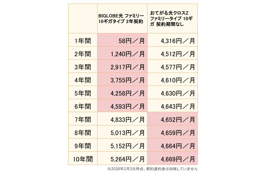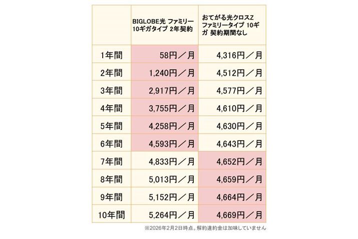 利用開始からの実質費用の安さを比べると、7年目で逆転します。ここを境に、想定される利用期間が長いか短いかで選び分けるとよいでしょう。6年以下なら「BIGLOBE光 ファミリー 10ギガタイプ 2年契約」が、7年以上なら「おてがる光クロスZ ファミリータイプ 10ギガ 契約期間なし」がおすすめですよ。
