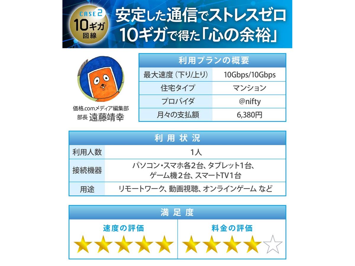 特に、オンライン会議中に映像や音声が途切れない安定感や、プロ野球中継をスマートTVで・競馬中継をタブレットで・YouTubeをPCで、と複数機器でそれぞれ高画質の動画を流しても遅延しないことに満足しており、10ギガを選んで良かったと実感しています。多くの機器をつないでも「まだ余裕がある」という安心感は、何物にも代えがたい快適さです。