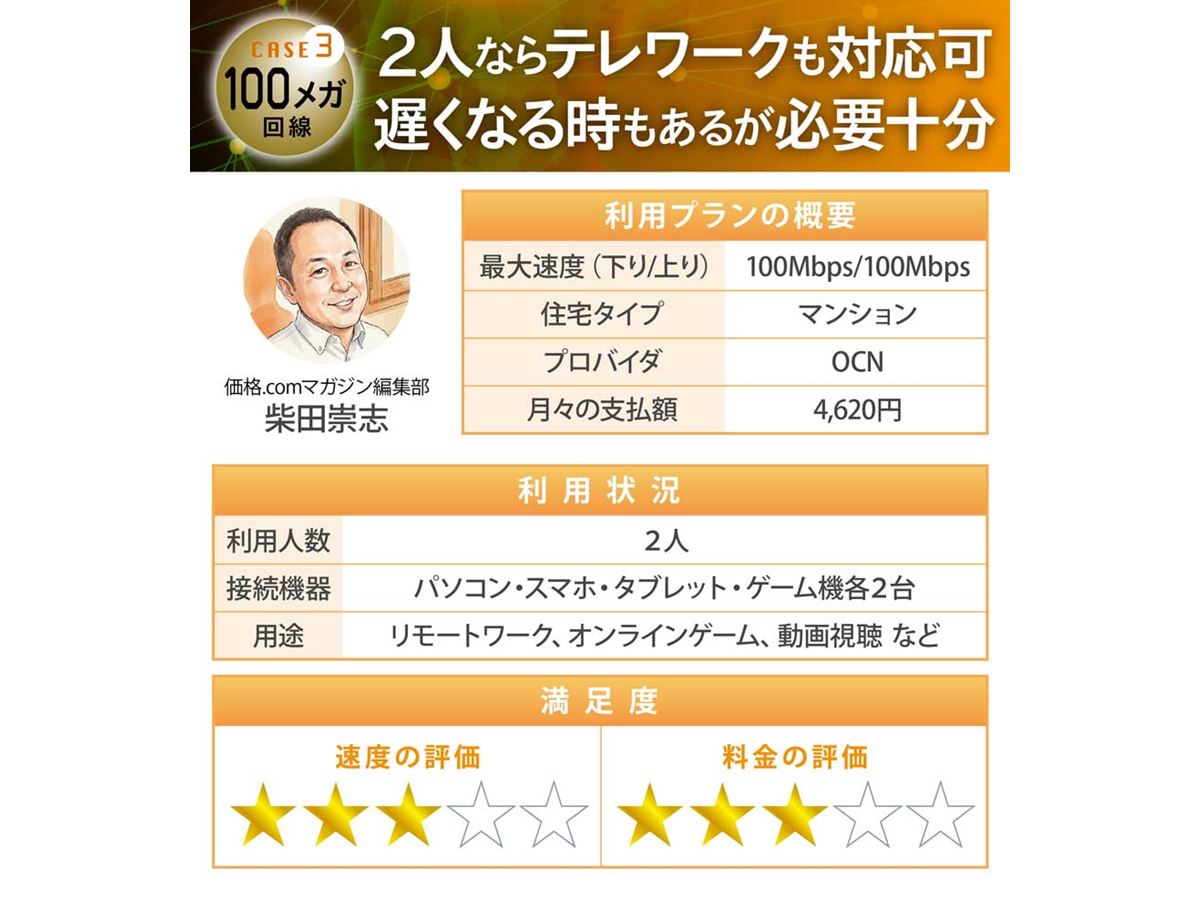 料金の水準は、満足度5段階で言えば「3」くらいです。高いとも思いませんが、最近は1ギガプランとの価格差も縮まっているようなので、安いとも感じません。速度・安定性について、致命的な問題はないものの、近いうちに高速なプランへの乗り換えを検討したいと考えています。