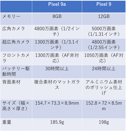 「Pixel 9a」はPixelシリーズのエントリーモデルに当たります。「Pixel 9」との違いで押さえておくべきものは下記のとおりです。下記以外にもWi-Fiの規格やディスプレイのコントラスト比など細かな点はありますが、使い勝手に大きな違いはないでしょう。
