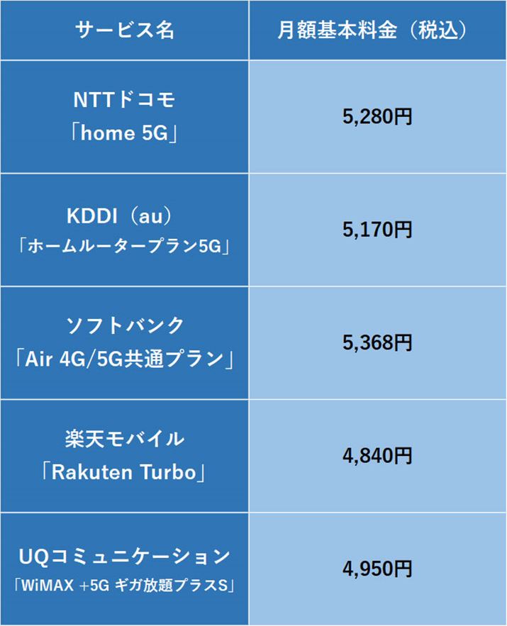 競合3社のホームルーターやそれに類するサービスの料金を確認してみると、KDDI(au)の「ホームルータープラン5G」は月額5,170円、ソフトバンクの「Air 4G/5G共通プラン」は5,368円、楽天モバイルの「Rakuten Turbo」は月額4,840円。なおKDDI傘下のUQコミュニケーションが提供する「UQ WiMAX」の「WiMAX +5G ギガ放題プラスS」は月額4,950円となっている。