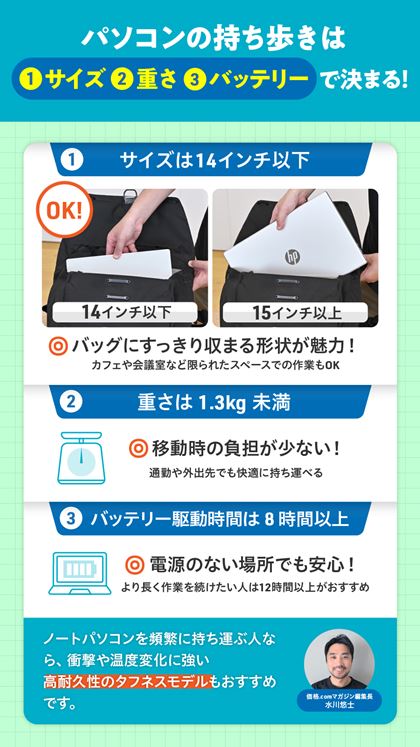 <基準2>サイズは14インチ以下の小型で、重さは1.3kg未満が目安
