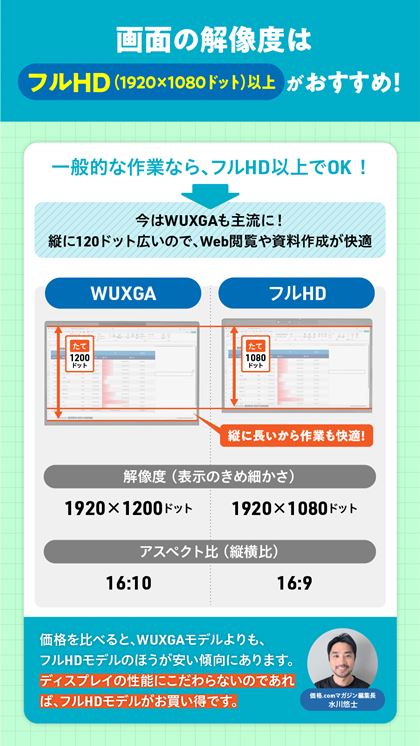 また、最近はWUXGA(1920×1200)のディスプレイを搭載したノートパソコンも増えています。WUXGAは、フルHDと比べて縦方向に120ドット広く、表示できる情報量が多くなることから、Webページの閲覧や資料作成、表計算ソフトの使用時にスクロールの回数が減って、作業効率が向上します。