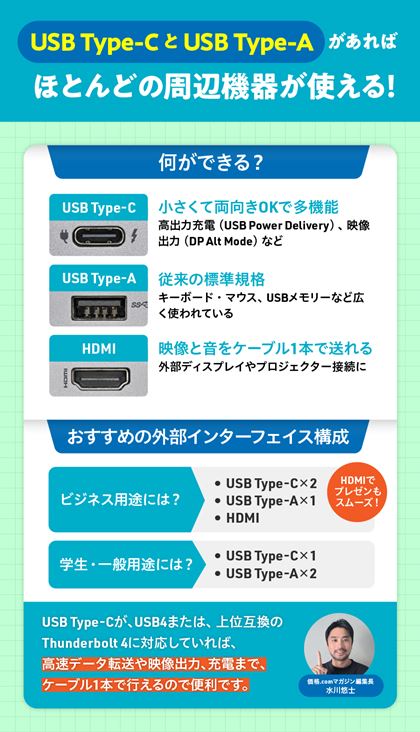 いっぽう、学生や一般ユーザー向けには、USB Type-C×1、USB Type-A×2という構成が使いやすいでしょう。USB Type-Aは、幅広い機器に対応した標準規格で、USBメモリーやゲーム用コントローラー、プリンターなどとの接続に便利です。また、USB Type-Cが1基だけでも、スマートフォンの充電や、外部ストレージとのデータ転送に対応できるため、一般的な使い方であれば問題はありません。