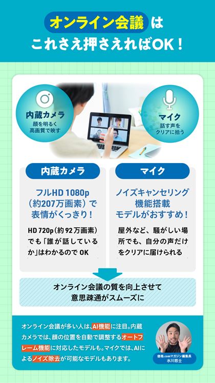 オンライン会議は内蔵カメラ、マイクの性能で変わる