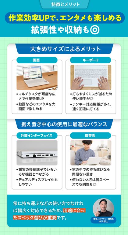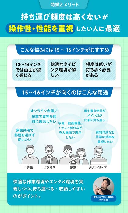 このような特徴をまとめると、15〜16インチのノートパソコンは、絶妙なバランスを備えた、使い方の幅が広いパソコンと言えるでしょう。