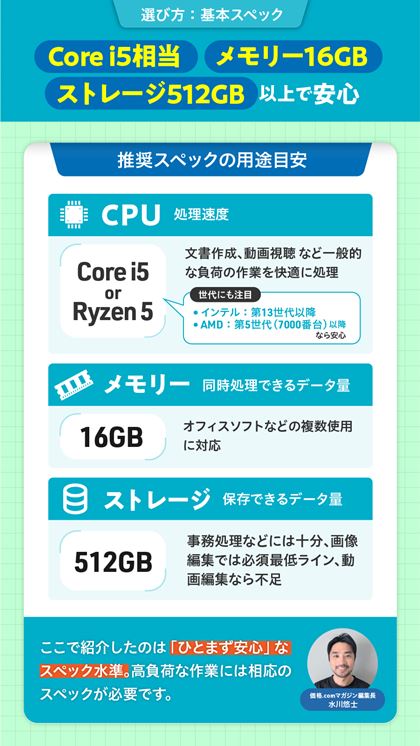 CPU、メモリー、ストレージの3つの基本スペックについては、「これだけあればひとまず安心」という水準がありますので、チェックしておきましょう。