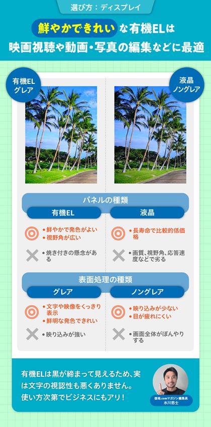 これらの特徴から、事務作業や文書作成などのビジネス用途中心なら液晶・ノングレア、映画視聴や写真・動画編集などエンタメやクリエイティブ用途中心なら有機EL・グレアが適しています。