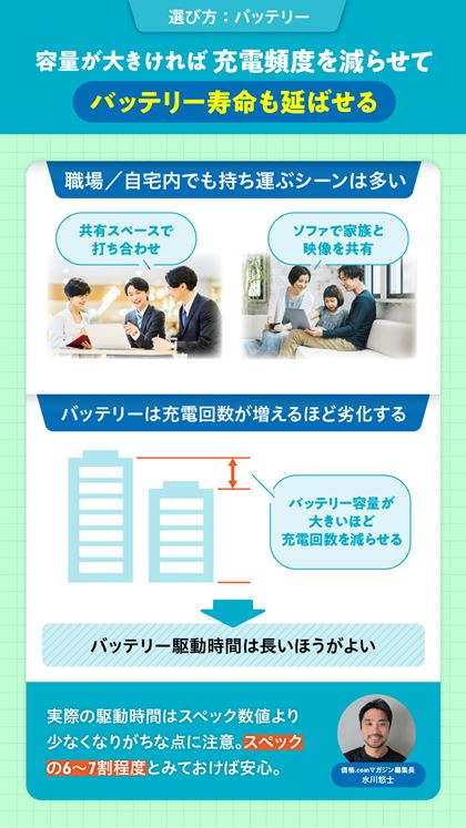 ノートパソコンは一般的に、搭載するバッテリーの容量が多いほうが駆動時間が長く、電源のない場所でもより長くパソコンを使えます。職場なら「共有スペースでの打ち合わせ」、家庭なら「ソファで家族といっしょに動画視聴」といったように、ノートパソコンを持ち運んで利用する機会があるのならバッテリーの性能(=容量)は軽視できません。