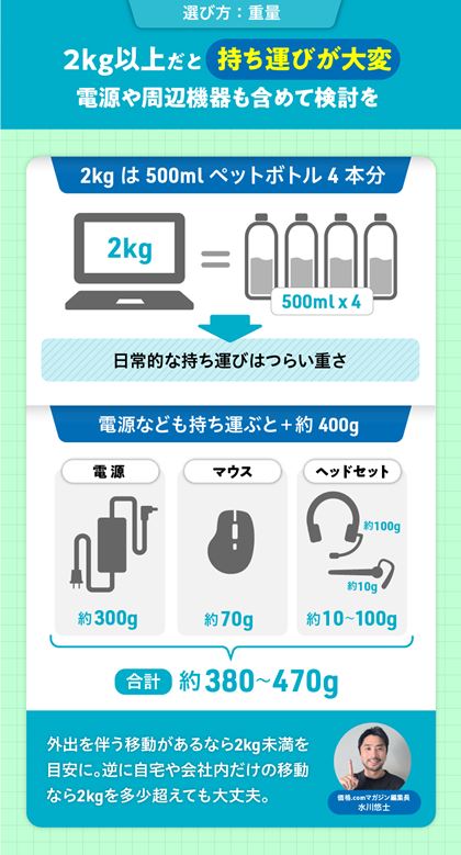 また、持ち運ぶ際は、周辺機器の重さにも注意が必要です。ACアダプターは約300g、マウスは約70g、ヘッドセットは形状により10〜100g程度が一般的で、持ち運ぶ周辺機器の合計が400gを超えることもあります。ノートパソコンを選ぶ際は、本体だけでなく、周辺機器も含めた総重量を把握しておくとよいでしょう。