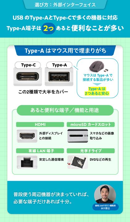 外部インターフェイスについては、種類と数をしっかり確認しましょう。用途に関わらず共通したポイントとして、USB Type-AとType-Cの両方を備えていると便利です。