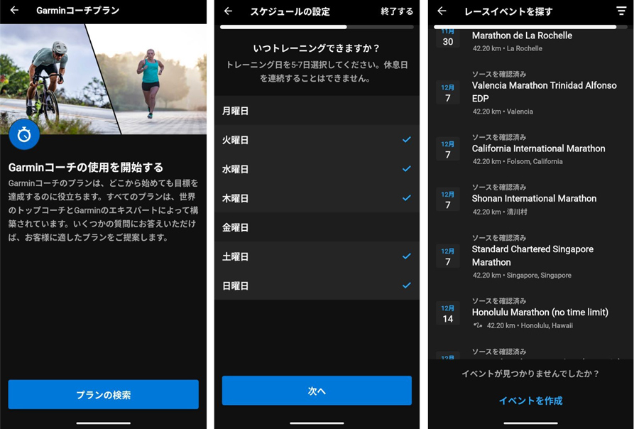 もし参加したいレースが決まっているのであれば、スマホアプリ「Garmin Connect」に登録された世界中のランニングイベントから、参加するレースを選択することで、当日までの期間に応じたあなたのための練習プランが作成されるのです。