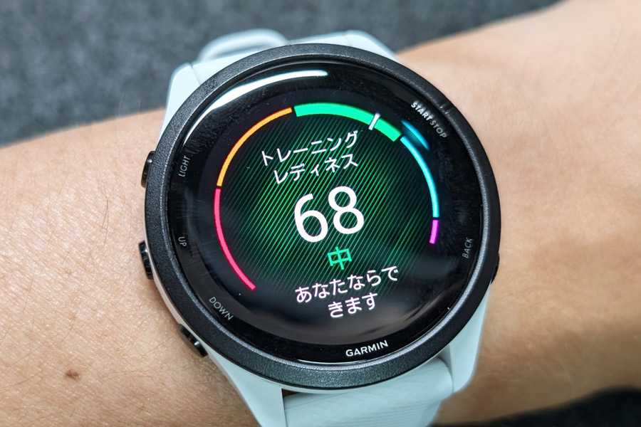 いっぽう、「Forerunner 265」は、さらに高度な「トレーニングレディネス」機能を搭載。回復状況やトレーニング負荷などを総合的に分析し、今日の練習に対する「準備度」を0から100の数値で明確に示します。この数値は実際の体感とも非常に近く、信頼できる指標だと感じました。