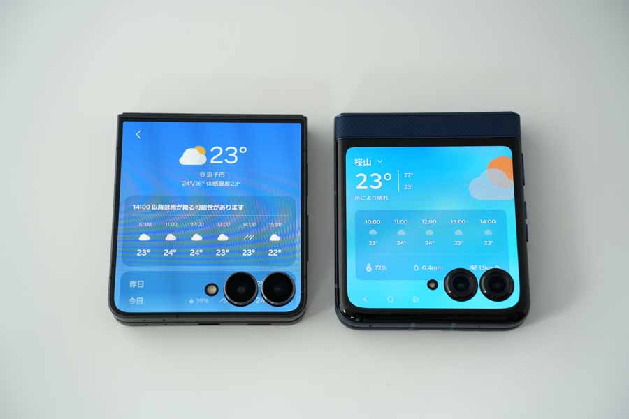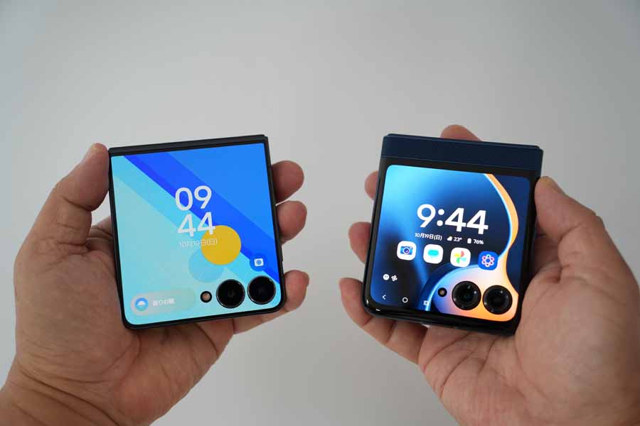 左が「Galaxy Z Flip7」、右が「motorola razr 60」。サイズ感は同等だが、ディスプレイは「Galaxy Z Flip7」のほうが広い