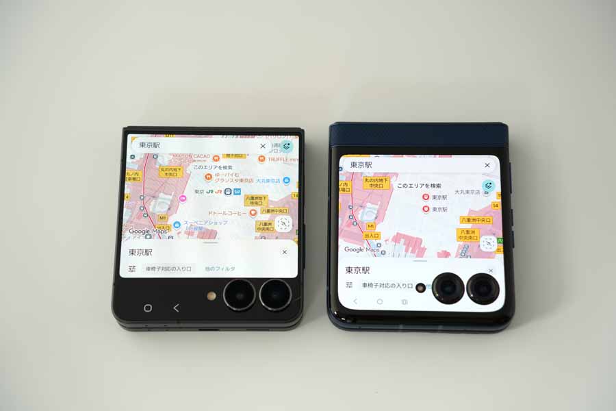 「マップ」を表示すると、「Galaxy Z Flip7」(左)はカメラを避ける表示となった。「motorola razr 60」(右)は画面いっぱいに表示されるが、カメラで情報の一部が隠れる