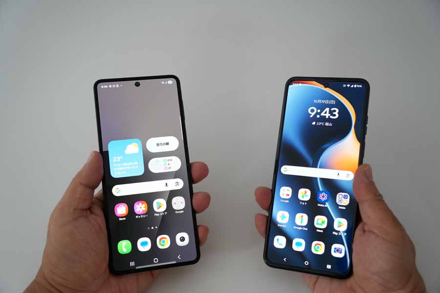 左が「Galaxy Z Flip7」、右が「motorola razr 60」。横幅は「Galaxy Z Flip7」のほうが太く、「motorola razr 60」のほうが縦に長い。持った感覚としては大差はない