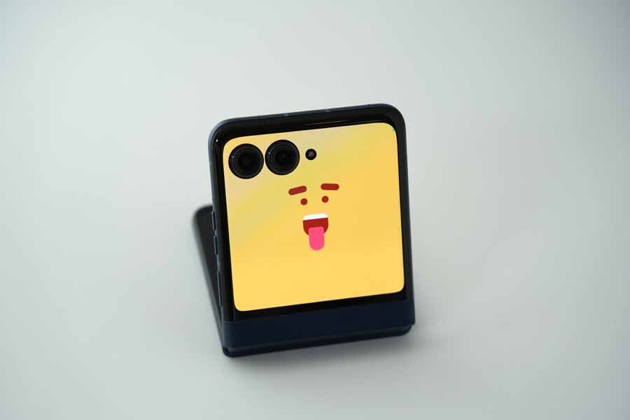 「motorola razr 60」は外側ディスプレイに、撮影される人に見せるためのアニメーションを表示できる。笑顔でカメラに目線を向けさせる趣向だ