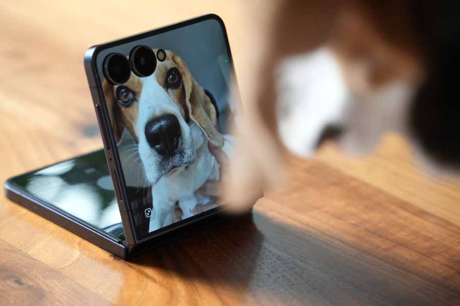折りたたみスマホは、卓上に置いて自撮りがしやすいことも魅力。「Galaxy Z Flip7」は被写体がフレームに収まるように自動調整される「オートズーム」機能があり、複数人で撮影する場合や、“踊ってみた” 的な動画を撮るときに重宝すること請け合いだ。