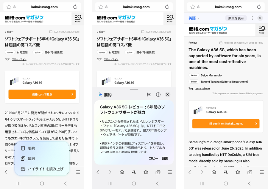 Galaxy独自の「ブラウザ」アプリでは、ウェブページを簡単に要約、翻訳できる