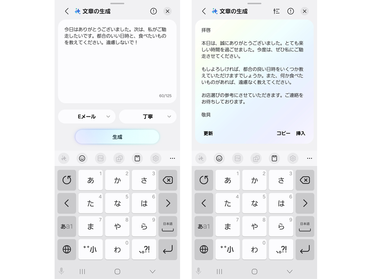 下書きの文章を入力し、用途と文体を指定すると、おすすめの文章を生成してくれる「入力アシスト」が便利