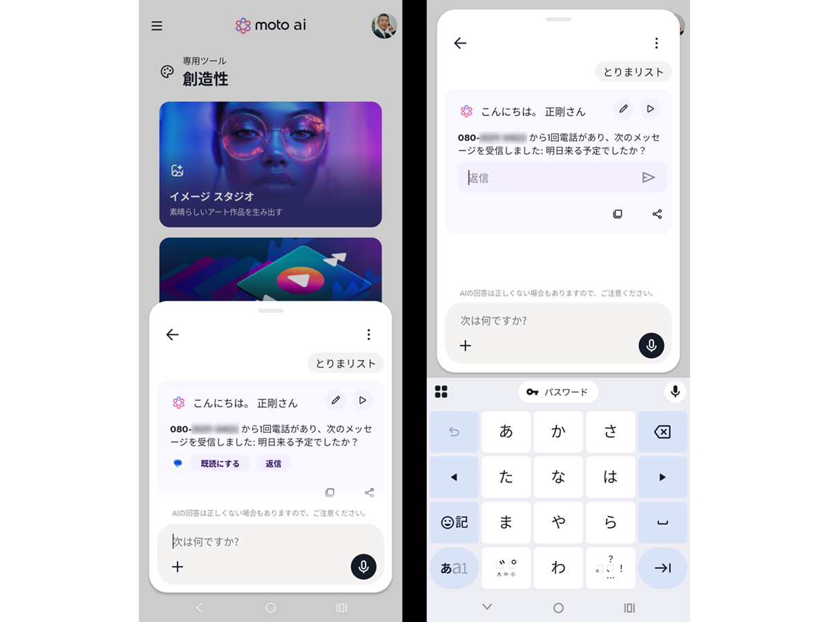 いっぽう、「motorola razr 60」には「moto ai」という機能が搭載されている。Galaxy AIに比べると機能は少なめだが、スマホでの使いやすさに配慮されている印象を受けた。