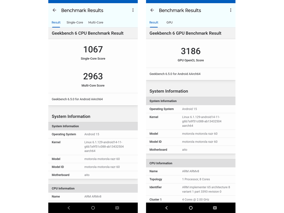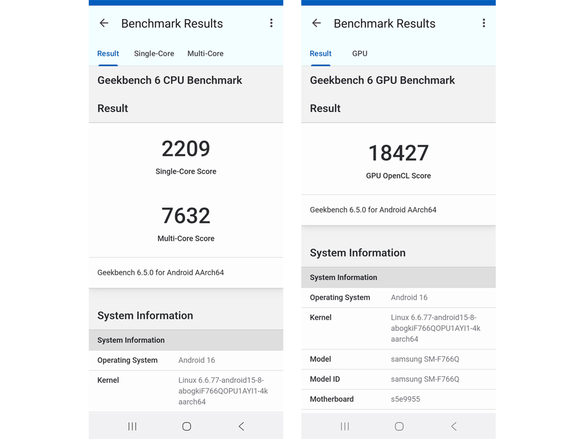 「Galaxy Z Flip7」の処理速度を「Geekbench 6」アプリで測定した結果。左がCPU、右がGPU。どちらもハイエンドらしい高いスコアをマークした