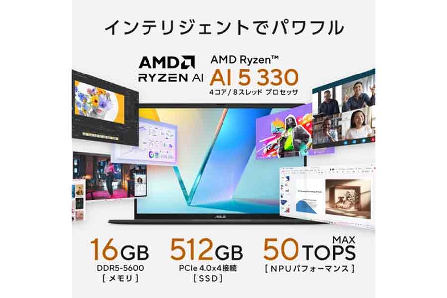 まず注目すべきは、「ASUS Vivobook S16(M3607)」の基本スペックだろう。10万円台(2025年11月17日時点の価格.com最安価格は109,800円)で買える比較的手ごろな価格ながら、メモリーは16GB、SSDは512GBとスペックは充実。CPUには最新の「AMD Ryzen AI 5 330」を搭載しており、すぐれたAI体験を可能にしている。この高効率なプロセッサーのおかげもあり、動画再生時最大約12.1時間の長時間バッテリー駆動も実現した。