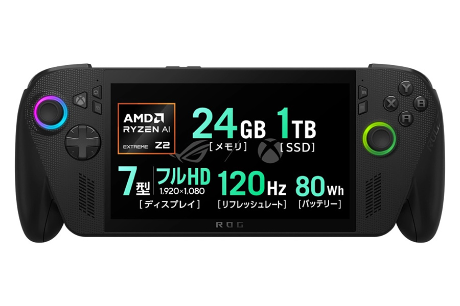 ASUSはラップトップ型のゲーミングノートPCのほかにも、ポータブルゲーム機「ROG Ally」シリーズも展開している。その最新モデルとして登場したのが「ROG Xbox Ally X(RC73XA-Z2E24G1T)」だ。「AMD Ryzen™ AI Z2 Extreme」プロセッサーに、リフレッシュレート120Hz対応の7インチフルHD(1920×1080)液晶ディスプレイを搭載し、快適なゲームプレイを実現。据え置き機並みのゲーム体験をどこでも楽しめる本格的なモバイルゲーム機に仕上がっている。