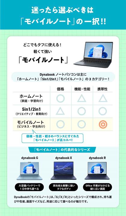 なかでも、「モバイルノート」に属する「dynabook G」シリーズは、軽量かつ堅牢なボディと長時間バッテリーを備え、外出が多いビジネスパーソンや学生におすすめです。高いパフォーマンスにより、ビジネスから学習用途、在宅ワークまでストレスなく使え、品質や性能、信頼性のバランスにすぐれ、「迷ったらこれ」という定番として支持されています。