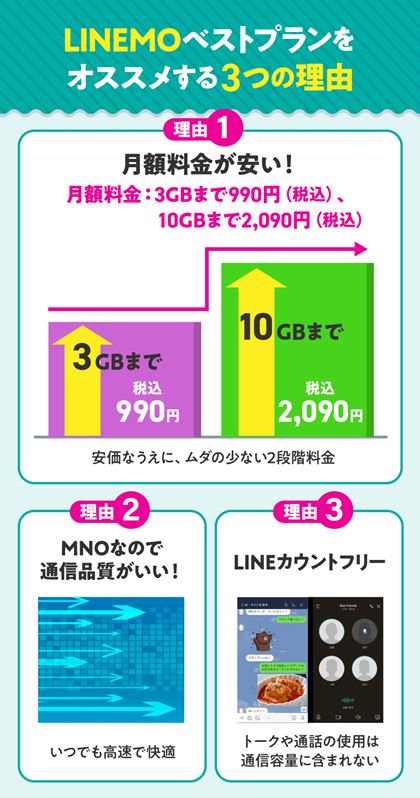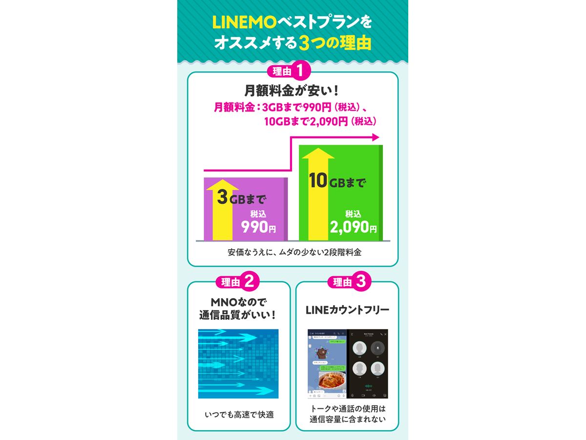 「LINEMO ベストプラン」をおすすめする理由は、安価なうえにムダの少ない2段階プランであること。3GBまでなら月額990円、ちょっと使いすぎた月でも10GBまで月額2,090円(いずれも税込)。しかも、ソフトバンクが直接運営するMNOなので通信品質も良好。さらに、独自のサービス「LINEギガフリー」も特徴です。
