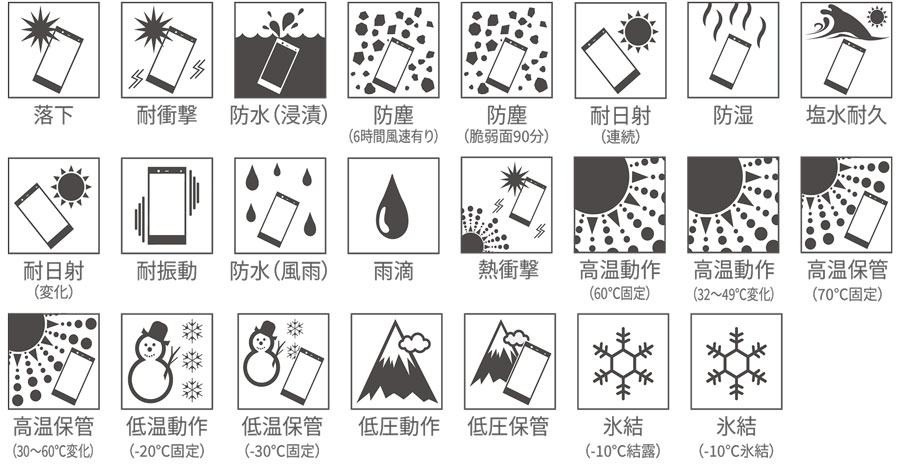米国国防総省の調達基準(MIL-STD-810H)の23項目、落下、耐衝撃、防水(浸漬)、防塵(6時間風速有り)、防塵(脆弱面90分)、塩水耐久、防湿、耐日射(連続)、耐日射(変化)、耐振動、防水(風雨)、雨滴、高温動作(摂氏60°固定)、高温動作(摂氏32〜49°変化)、高温保管(摂氏70°固定)、高温保管(摂氏30〜60°変化)、低温動作(摂氏-20°固定)、熱衝撃、低温保管(摂氏-30°固定)、低圧動作、低圧保管、氷結(摂氏-10°氷結)、氷結(摂氏-10°結露)に準拠した試験を実施。充電可能な温度範囲:摂氏5〜35°。使用環境:温度摂氏5〜35°、湿度45〜85パーセント。風呂場では、温度は摂氏5〜45°(ただし、温度は摂氏36°以上または湿度86パーセント以上は一時的な使用に限ります)。湿度は45〜99パーセント、なお、すべての機能の連続動作を保証するものではありません。また、調査の結果、お客さまの取扱いの不備による故障と判明した場合、保証の対象外となります。