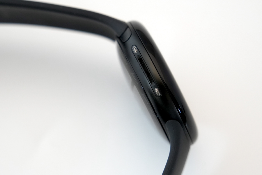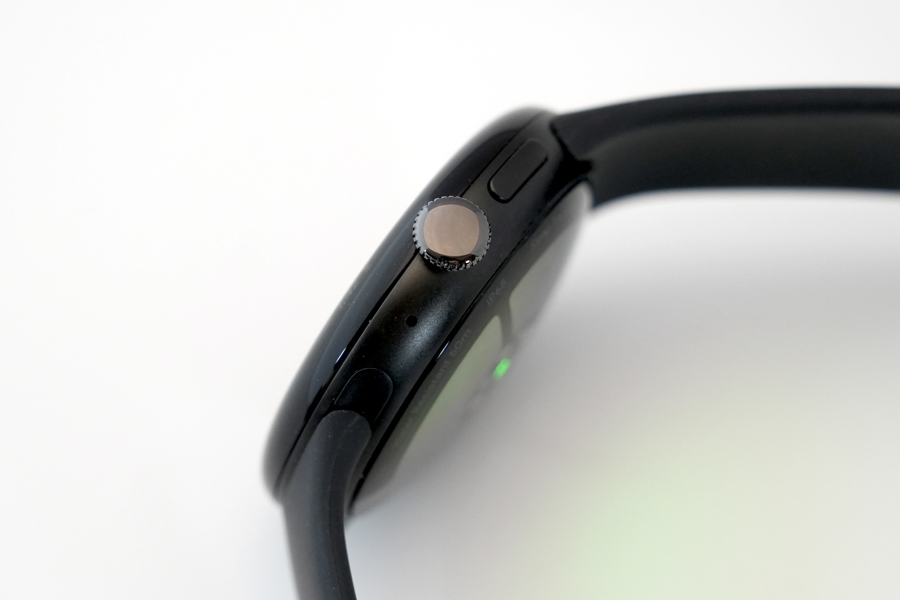 右側面にリューズがあり、その上にサイドボタン、下にマイクがある