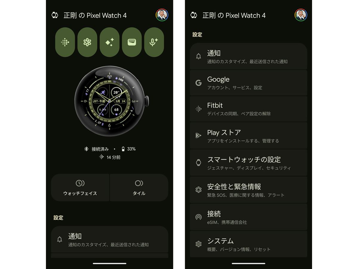 対応するスマホはAndroidのみ。スマホには、各種設定などに用いる「Google Pixel Watch」アプリ(以下、「Watch」アプリ)と、健康と運動のデータを管理する「Fitbit」アプリをインストールする必要がある。