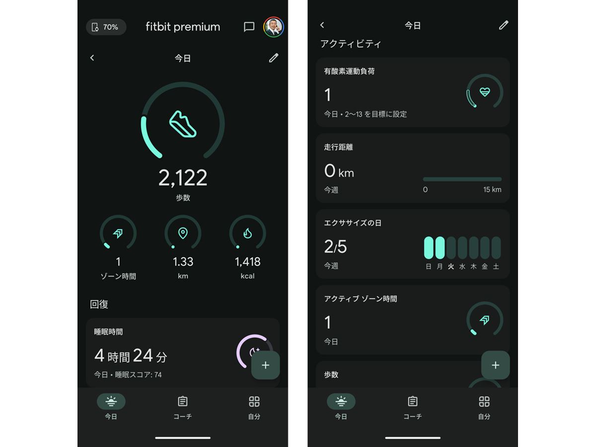 「Fitbit」アプリでは、ヘルスケアや運動のデータを管理する。なお、ユーザーに最適化したプログラムが提案され、細かい分析結果が表示される「Fitbit Premium」(月額640円)を無料で6か月間利用できる