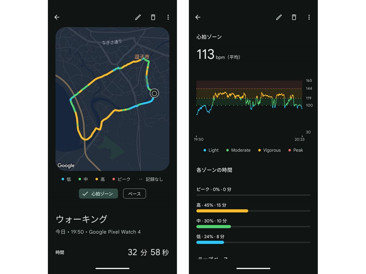 ウォーキングの結果画面。高精度デュアル周波数GPSにより、位置情報の精度も向上している