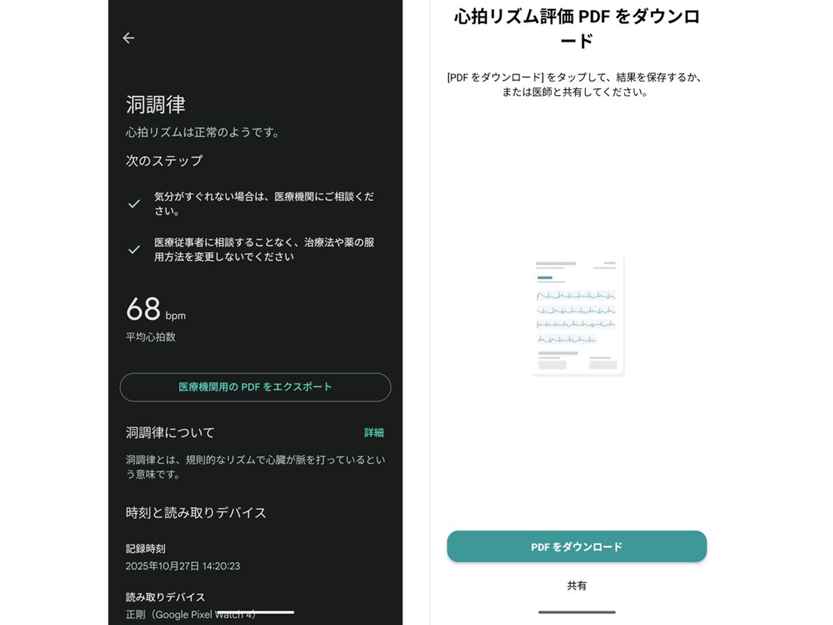 心臓が正常なリズムで拍動している場合は「洞調律」と表示される。おそらく、多くの人は常に「洞調律」に表示されるはずだ。もし、「心房細動」と表示されたら、自覚症状はなくとも、病院でより精密な検査を受けたほうがいいだろう。その際、「Pixel Watch 4」で測定した心電図をプリントして医師に見せることもできる。